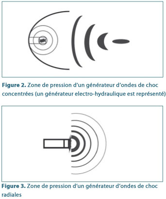 Les ondes de choc radiales sont produites par un marteau pneumatique et émises de manière radiales. L’intensité des ondes de choc est la plus forte à la sufrace (de la peau) et décroit lorsqu’elles se déplacent en profondeur. Les ondes sont divergentes.